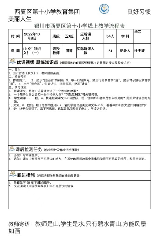 自10月8日起,西夏区第十小学全面开展线上教学工作,以“云端”授课的方式开展了别样的战“疫”,展示出教育人应有的责任和担当,在实践中又一次经受住了考验。
