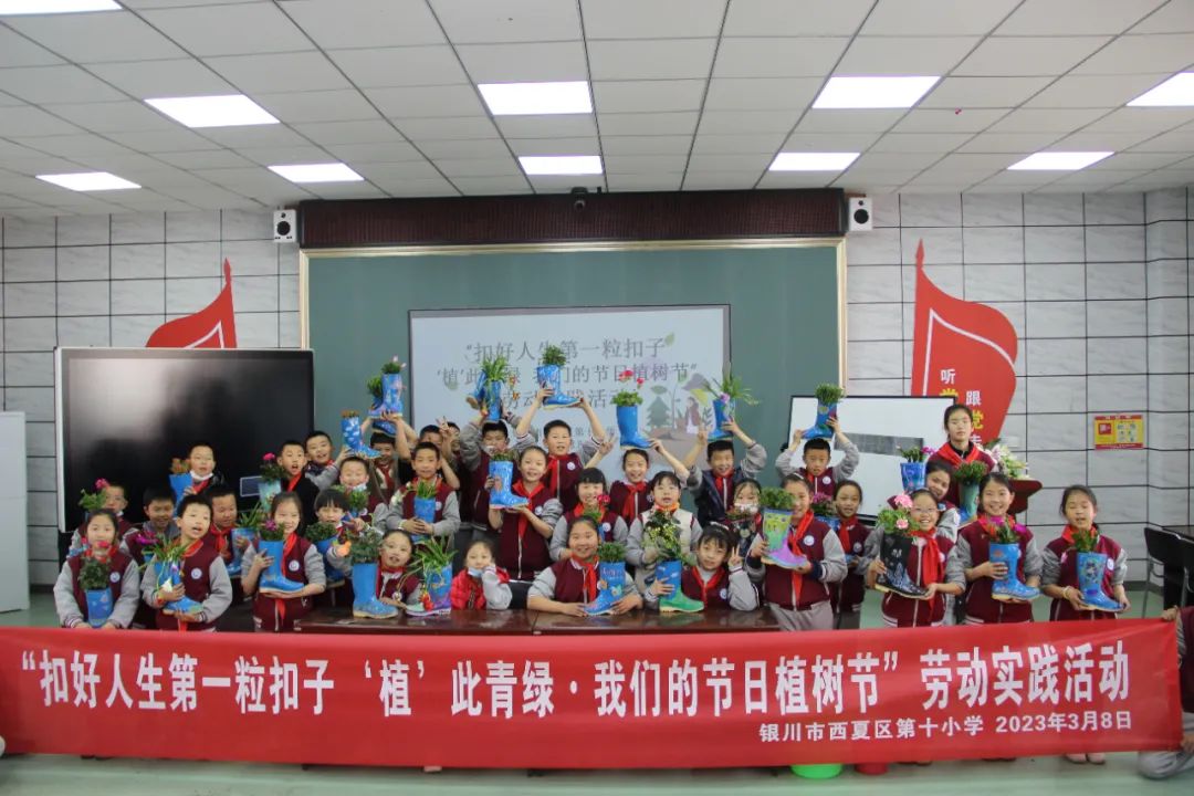 阳春三月,草长莺飞。为丰富学生的劳动实践,增加劳动技能,银川市西夏区第十小学开展了“‘植’此青绿·我们的节日植树节”劳动实践活动。