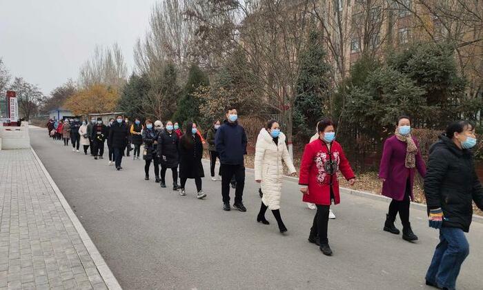 (家长佩戴口罩有序排队进入校园)
